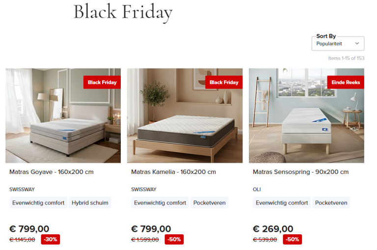 Op hun speciale Black Friday pagina vind je de beste promoties op matrassen en bedbodems. Verwacht kortingen op topmerken zoals Dorsoline, Dreamway, Art Bedding, Epeda, Bultex, Swissway en Oli.
